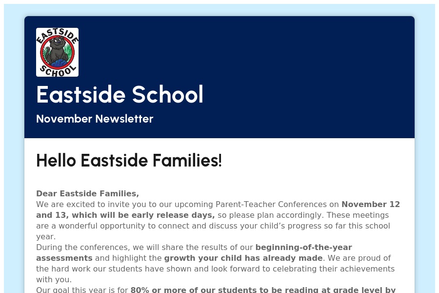 Eastside School November Newsletter Hello Eastside Families! Dear Eastside Families, We are excited to invite you to our upcoming Parent-Teacher Conferenceson November 1. . .
